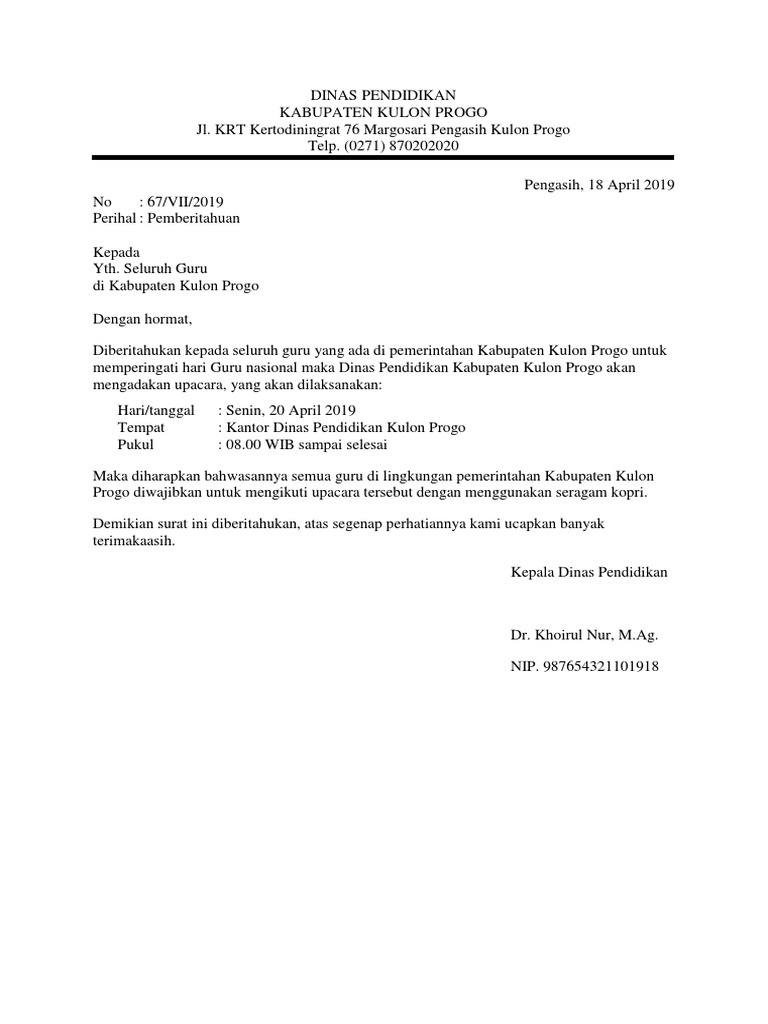 Surat dinas adalah surat yang dibuat oleh sebuah instansi baik instansi swasta maupun negeri seperti sekolah, instansi pemerintahan dll. Surat dinas sekolah merupakan surat resmi yang dikeluarkan oleh pihak sekolah yang ditujan kepada orang tua maupun wali mudrid. Pada umumnya surat dinas dibuat oleh instansi atau lembaga baik pihak swasta ataupun negeri misalnya seperti sekolah, perusahaan. Pemerintah provinsi yogyakarta dinas pemuda dan olahraga kabupaten bantul jl. Surat dinas bertipe pemerintah digunakan sebagai media tertulis untuk mengkomunikasikan segala hal yang berkaitan dengan kedinasan, mulai dari pemberitahuan hingga pengumuman dan lain lain.