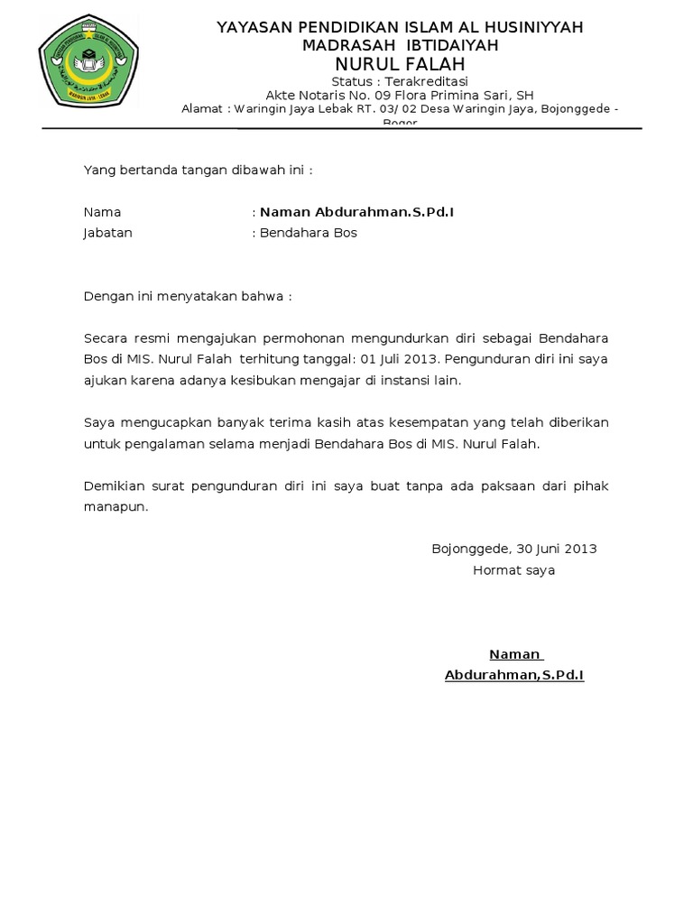 Contoh surat pengunduran diri kerja, organisasi, sekolah atau instansi untuk semua keperluan baik resmi maupun non resmi. Fungsinya adalah untuk melegalkan status tanggung jawab di perusahaan dan persyaratan administratif. Contoh surat pengunduran diri berikut ini mungkin bisa 20. Contoh surat pengunduran diri guru. Surat pengunduran diri guru adalah sebuah surat resmi yang dibuat oleh guru yang bersangkutan yang menjelaskan bahwasanya ia bermaksud untuk resign atau mengundurkan diri dari sekolah pada waktu tertentu dan dengan alasan tertentu. Pada zaman dahulu guru pernah menjadi pekerjaan yang dipandang sebelah mata. Contoh surat pengunduran diri kerja karyawan 3.3. Penggunaan berbagai contoh surat pengunduran diri ini berguna untuk menunjukkan profesionalitas sebagai seorang guru. Savesave 2 contoh surat pengunduran diri seorang guru yang. Contoh surat pengunduran diri dari guru. Download contoh surat pengunduran diri bahasa inggris doc. Secara resmi terhitung hari ini tanggal 26 november 2018, saya mengundurkan diri sebagai guru matematika di. Dan harapannya, ia bisa tetap bekerja sampai jangka waktu yang lama bahkan hingga pensiun.