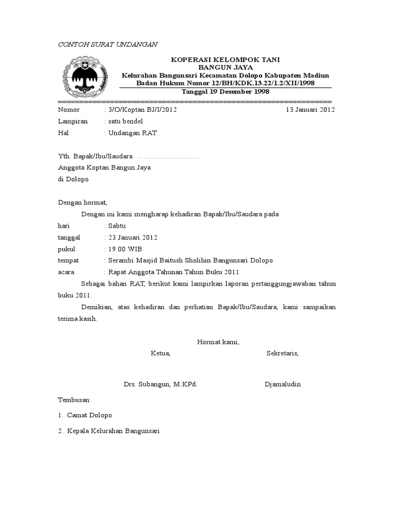 Contoh surat undangan resmi dan tidak resmi. Dalam sebuah organisasi atau instansi pemerintah atau swasta biasanya memerlukan surat dinas untuk memberikan perintah, undangan atau hal lain yang berkaitan dengan kegiatan kelembagaan. Apa yang dimaksud dengan surat undangan? Untuk file word yang sudah jadi silahkan download link dibawah ini. Dinas pendidikan kabupaten/kota — harap segera mengirimkan alamat email ke bopprestasi2012@yahoo.co.id agar kami bisa segera memberikan format mou. Adapun tujuan dari penerbitan surat keterangan tidak mampu ini adalah sebagai persyaratan administrasi beasiswa surat pengantar dinas biasanya dipergunakan oleh isntansi pemerintahan maupun oleh perusahaan. Membangun koperasi koperasi membangun (prosedur pendirian koperasi) suatu koperasi tertulis kepada diajukan kepada kepala dinas koperasi dan usaha kecil menengah, dengan 2. Koperasi dengan status belum bersertifikat nik diharapkan segera melaporkan berita acara rapat anggota tahunan (rat) dan melengkapi data sesuai formulir nomor induk koperasi doc/ pdf serta melaporkan ke kantor dinas yang. Sehubungan dengan telah dilaksanakannya dies natalis sma airlangga yang ke 15, maka akan diadakannya rapat. Minggu, 7 oktober 2018 jam: Panita pelaksana rat ke x. Admin blog berbagi contoh surat kopkar mitra sejahtera undangan rat 2015. Pemerintah kota bandar lampung dinas pendidikan unit pendidikan.